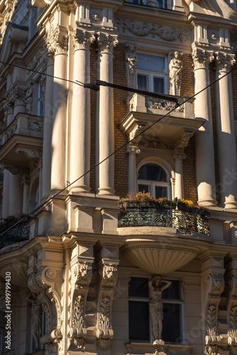 A close-up, low-angle view highlights the ornate corner of a historic building facade, richly decorated with classical architectural elements