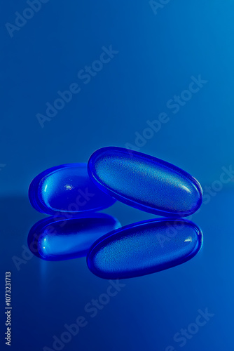 A close-up macro shot of two blue pills resting on a reflective surface.