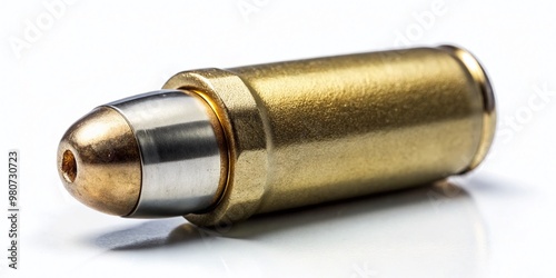A close-up of a 9x19mm Parabellum cartridge, a type of handgun ammunition, isolated on a white background with