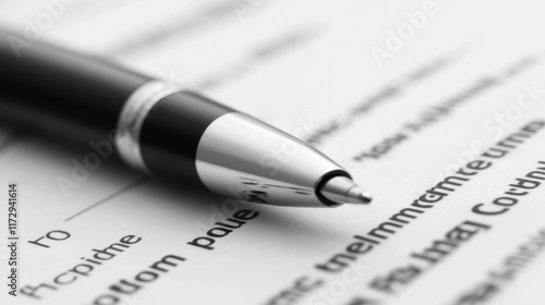 A close-up of a ballpoint pen, with a smooth, sleek design, placed on top of a document awaiting review.