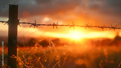 A close-up of a barbed wire fence at a border, with the sun setting in the background, creating a dramatic silhouette effect