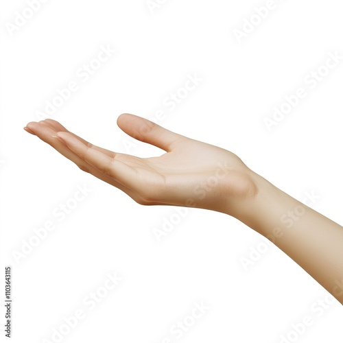 A close-up of a beautiful woman's hand, isolated on a white background, elegantly holding something between her fingers, captured in a realistic photograph that emphasizes the delicate details
