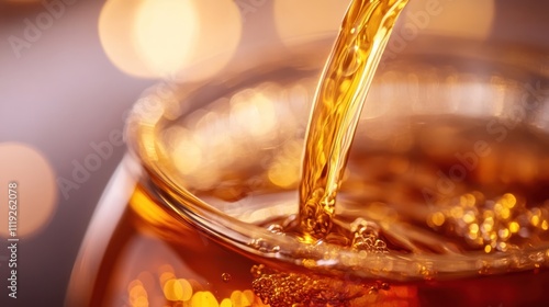 A close-up of a beverage being poured into a glass, showcasing its rich color and bubbles.