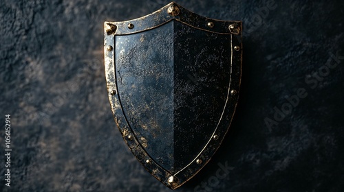 A close-up of a black shield against a dark background