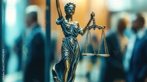 A close-up of a blindfolded Lady Justice statue holding scales of justice