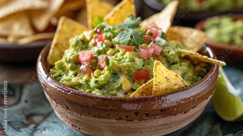A close-up of a bowl of fresh guacamole with tortilla chips