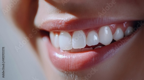 a close-up of a bright, healthy smile, aligned teeth and soft pink lips reflect excellent dental hygiene and care. The smooth skin and natural lighting enhance the freshness and positivity