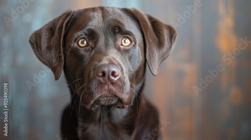 A close-up of a brown Labrador Retriever looking curiously towards the camera in a cozy indoor setting during the day