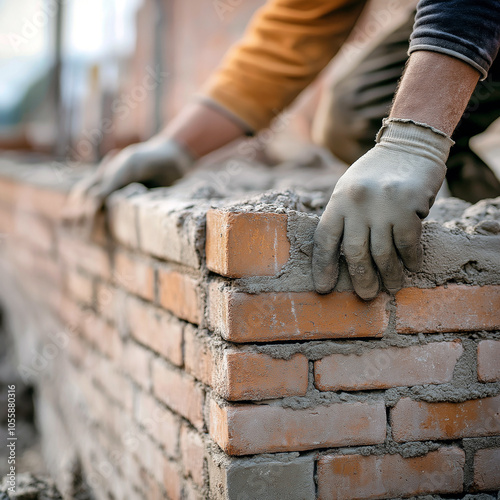 A close-up of a builder laying bricks with precision, mortar between the bricks, and tools scattered around.