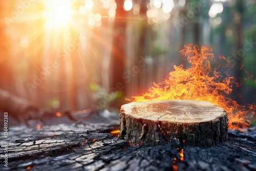 A close-up of a burning tree stump with flames emerging, surrounded by a forest illuminated by sunlight filtering through the trees.