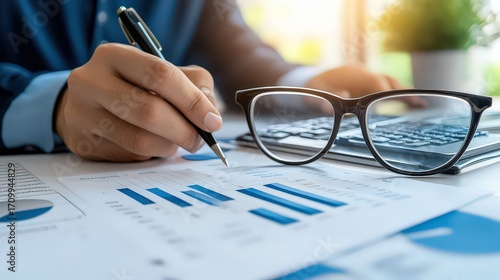 A close-up of a business professional analyzing financial data with a pen, while wearing glasses, This image is ideal for presentations, financial reports, and articles about business analytics,