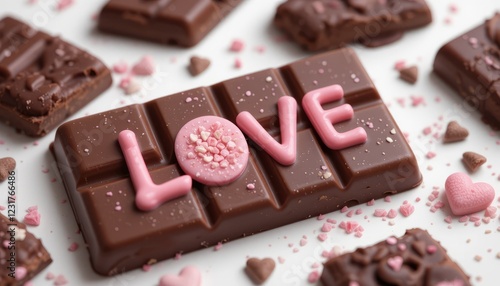 A closeup of a chocolate bar with nuts and cocoa with pink letter LOVE, isolated on a white background, highlighting its sweet and delicious details