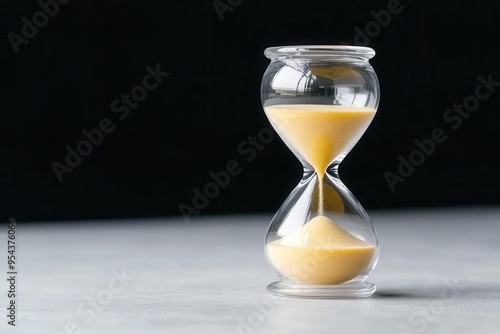 A close-up of a classic hourglass, showcasing the flowing sand that symbolizes the passage of time in a minimalist setting.