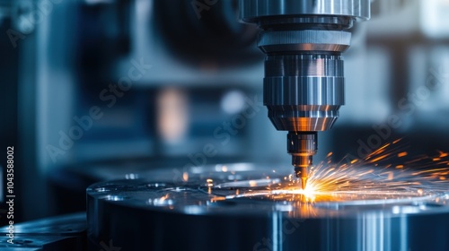 A close-up of a CNC machine cutting metal, producing sparks during the machining process.