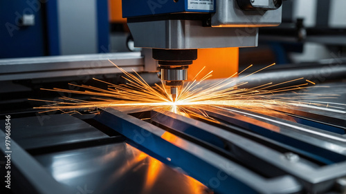 A close-up of a CNC machine cutting metal with sparks flying around in a high-tech industrial environment.