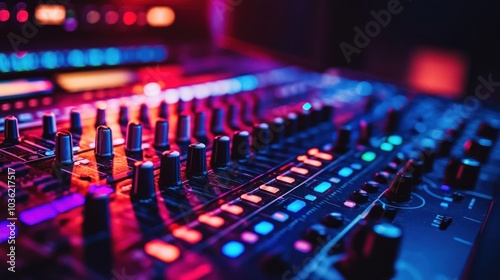 A close-up of a colorful audio mixing console with illuminated controls and knobs.