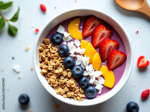 A close-up of a colorful smoothie bowl with granola, coconut flakes, and sliced fruits, framed by a minimalist white bowl and wooden spoon, leaving room for text about healthy eating
