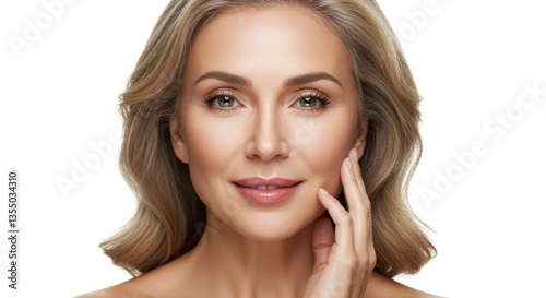 A close-up of a confident woman with glowing skin and natural makeup, elegantly resting her hand on her face. Perfect for beauty, skincare, and wellness themes.