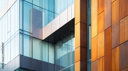 A close-up of a contemporary building facade with a unique blend of materials like glass, steel, and wood.