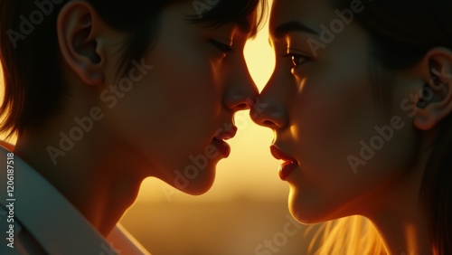 A close-up of a couple about to kiss, surrounded by warm light and a romantic atmosphere..
