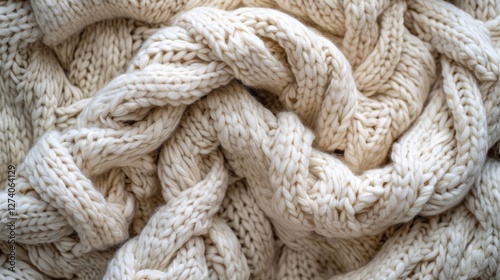 A close-up of a cozy, intricately knitted cream-colored blanket.
