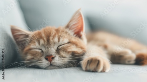 A close-up of a cute ginger kitten sleeping peacefully on a blue couch, capturing the essence of relaxation and comfort.
