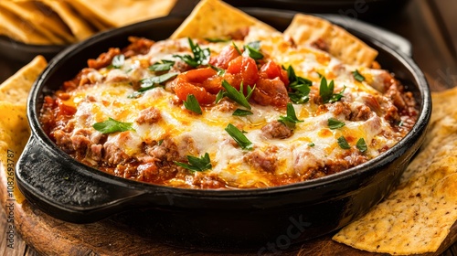A close-up of a delicious, bubbling dish featuring meat, cheese, and fresh toppings served in a black skillet, accompanied by crispy tortilla chips, perfect for food blogs, menus, or recipe books,