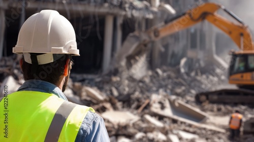 A close-up of a demolition supervisor in a hard hat and reflective vest, overseeing a demolition site with machinery and debris in the background, Demolition supervision scene