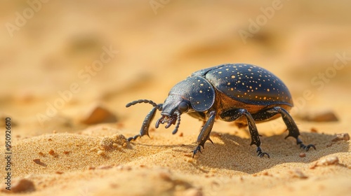 A close-up of a desert beetle crawling across the sand, illustrating the small creatures that inhabit the desert