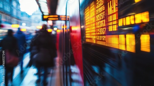 A close-up of a digital timetable inside a commuter rail car, with blurred passengers boarding at a station.