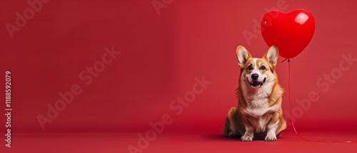 A close-up of a dog holding a red balloon in the shape of a heart against a red background that is studio-clean and has adequate room for writing, Generative AI.