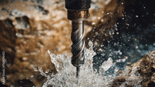 A close-up of a drill bit cutting through rock, with water splashing around it.