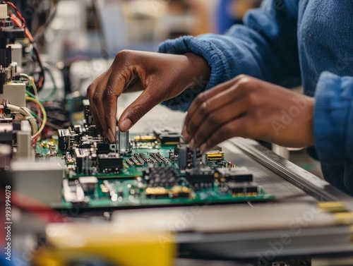 A close-up of a factory worker's hands as they meticulously assemble small components, emphasizing the precision and focus required in high-tech manufacturing environments