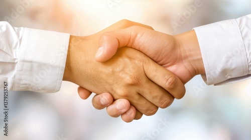 A closeup of a firm handshake symbolizes partnership and trust between professionals in a blurred, elegant background.