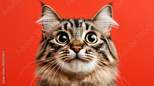 A close-up of a fluffy cat with wide eyes, set against a vibrant red background, exuding a curious and playful expression.