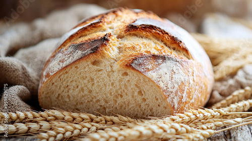 A close-up of a freshly baked loaf of sourdough bread, with a crispy golden crust, sliced open to reveal a soft, surrounded by wheat stalks