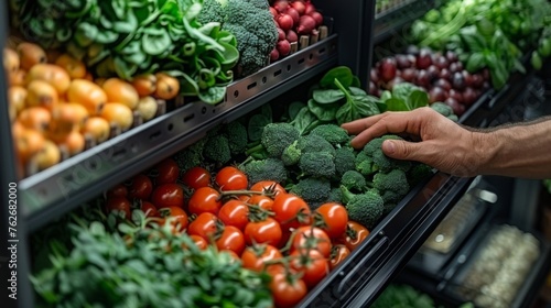 A close-up of a fridge door opening, revealing neatly organized sections of fresh produce, whole grains, and low-fat dairy options, with a persons hand reaching for a bundle of spinach