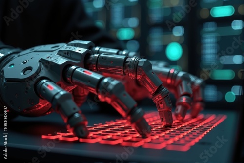A close-up of a futuristic robotic hand reaching out towards a complex circuit board illuminated