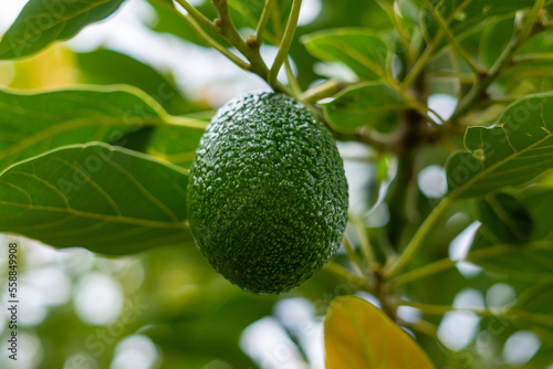 A close-up of a genetic avocado on a tree