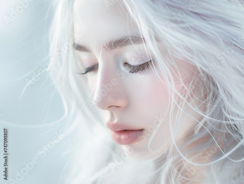 A close-up of a girl with silver hair holding a delicate pink rose in cold delicate tones to her face