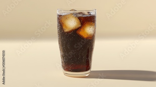 A close-up of a glass of cola with ice cubes, condensation forming on the surface, placed on a plain background with space for text.