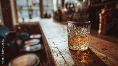 A close-up of a glass of golden whiskey on a wooden bar, with ice cubes