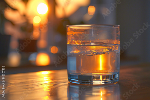 A close-up of a glass of water with ice, reflecting the golden sunset. The soft focus background adds warmth