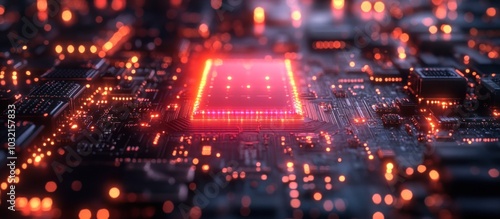 A close-up of a glowing red circuit board with a chip in the center.