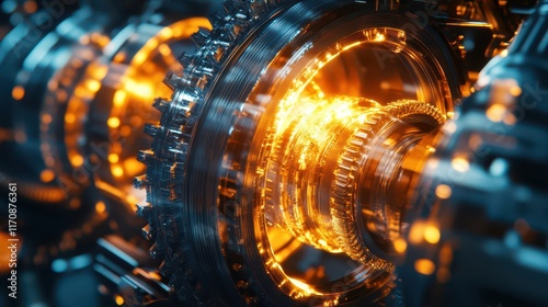 A close-up of a glowing steel gear system, rotating with precision and creating an intricate dance of mechanical parts.