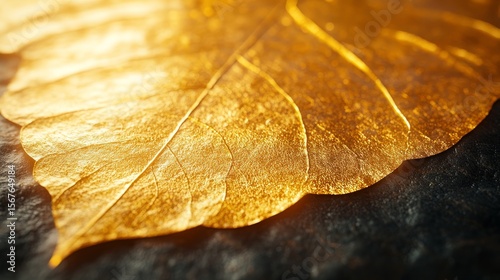 A close-up of a golden leaf reflects warm light, highlighting nature's exquisite beauty and detail