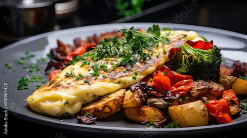 A close-up of a gourmet omelet with a side of roasted vegetables and artisan bread. Generative AI.