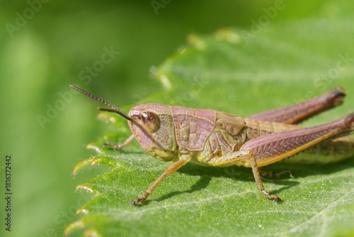 A close-up of a grasshopper resting on a vibrant green leaf, showcasing its intricate details and textures in the natural setting.