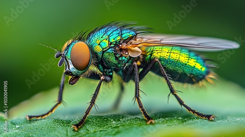 A close-up of a green fly perched on a leaf with a blurred nature background.