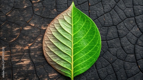A close-up of a green leaf on a dark, textured surface, showcasing the contrast between vibrant life and decay.